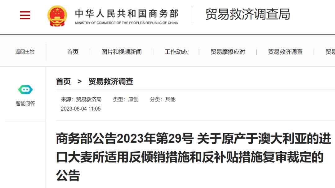 香港新聞網8月4日電 中國商務部4日發布《關於原產於澳大利亞的進口大麥所適用反傾銷措施和反補貼措施複審裁定的公告》,具體內容如下: 2020年5月18日,商務部發布2020年第14號和第15號公告,決定對原產於澳大利亞的進口大麥徵收反傾銷稅和反補貼稅,實施期限自2020年5月19日起5年。 2023年4月14日,應中國酒業協會申請,商務部發布2023年第12號公告,決定對原產於澳大利亞的進口大麥繼續徵收反傾銷稅和反補貼稅的必要性進行複審。經過調查,根據《中華人民共和國反傾銷條例》第四十九條和《中華人民共和國反補貼條例》第四十八條的規定,商務部作出複審裁定。現將有關事項公告如下: 一、複審裁定 商務部裁定,鑒於中國大麥市場情況發生變化,對原產於澳大利亞的進口大麥繼續徵收反傾銷稅和反補貼稅已無必要。 二、取消反傾銷稅和反補貼稅 根據《中華人民共和國反傾銷條例》第五十條和《中華人民共和國反補貼條例》第四十九條的規定,商務部向國務院關稅稅則委員會提出取消反傾銷稅和反補貼稅的建議,國務院關稅稅則委員會根據商務部的建議作出決定,自2023年8月5日起,終止對原產於澳大利亞的進口大麥徵收反傾銷稅和反補貼稅。 三、行政訴訟和行政複議 根據《中華人民共和國反傾銷條例》第五十三條和《中華人民共和國反補貼條例》第五十二條的規定,對本複審決定不服的,可以依法申請行政複議,也可以依法向人民法院提起訴訟。 本公告自2023年8月5日起執行。