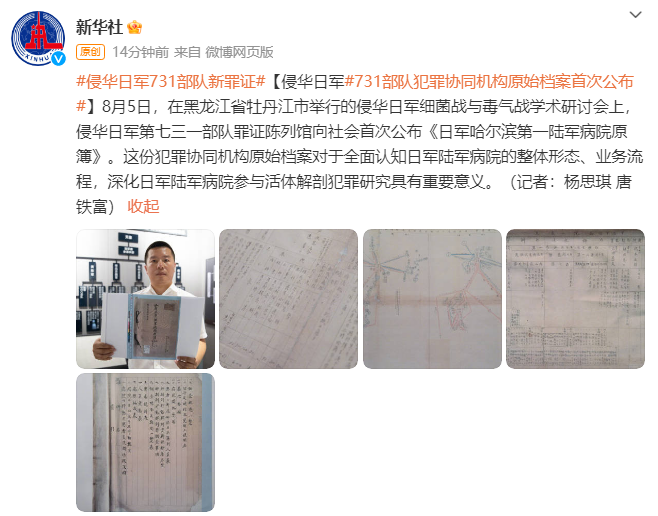 香港新聞網8月6日電 新華社消息,8月5日,在中國黑龍江省牡丹江市舉行的“侵華日軍細菌戰與毒氣戰學術研討會”上,侵華日軍第七三一部隊罪證陳列館,首次向社會公佈了《日軍哈爾濱第一陸軍病院原簿》。據介紹,這份犯罪協同機構原始檔案,對於全面認知日軍陸軍病院的整體形態、業務流程,深化日軍陸軍病院參與活體解剖犯罪研究具有重要意義。(完)