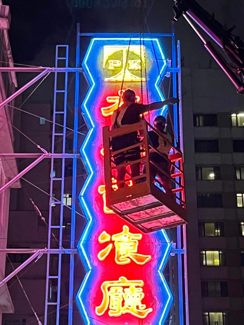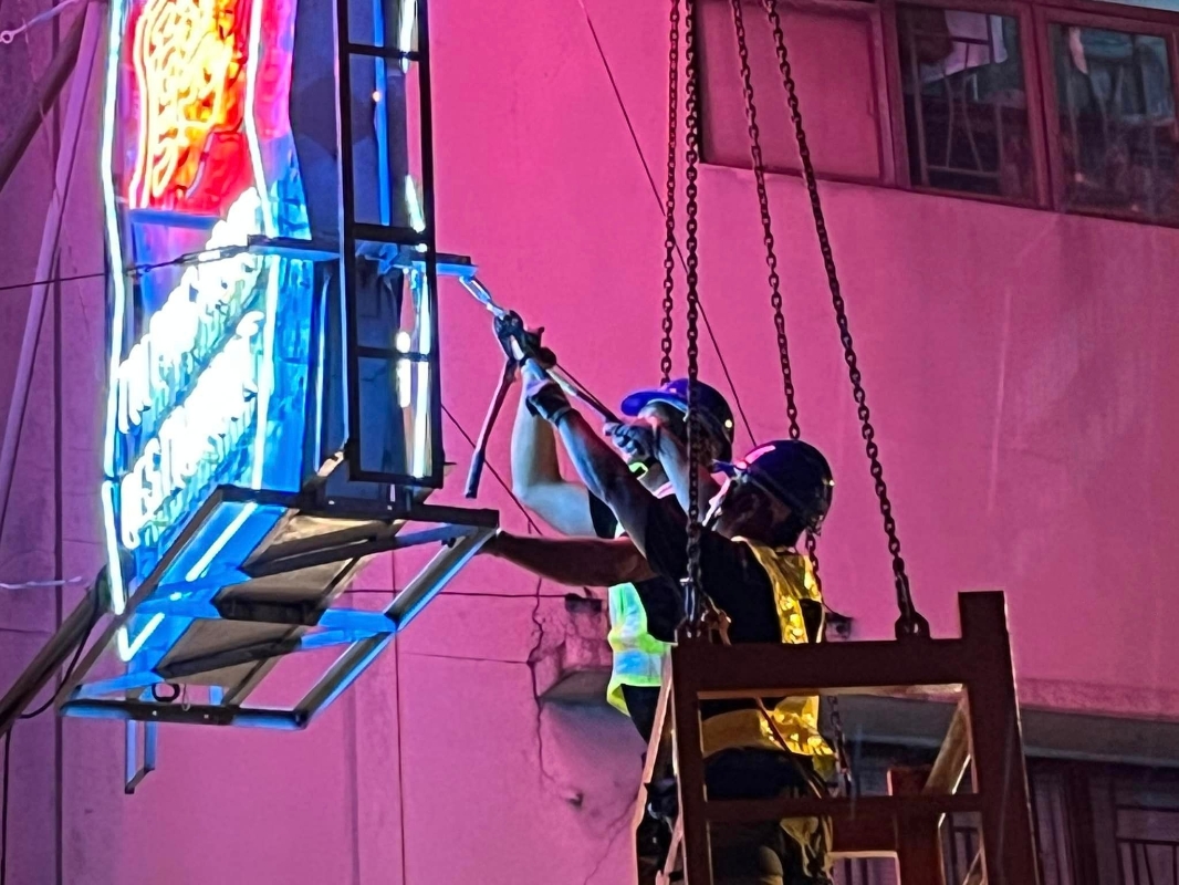 工人拆除佐敦分店的霓虹招牌。霓虹黯色fb圖片 唯一安慰的是,該招牌將交予保育機構作文化保育,避免運送到堆填區當廢物棄掉,稍後亦會移師至中環大館重新展出。