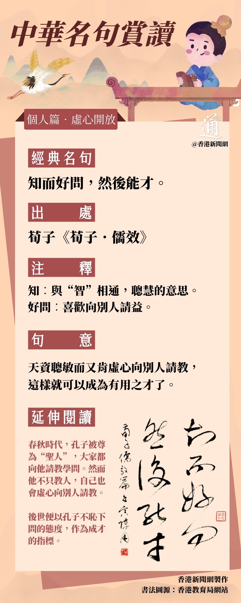 香港新聞網9月4日電 為加強中國文學和文言經典的學習,香港特區政府教育局繼續開展“中華經典名句推廣活動”,從《致知達德》(中華傳統美德語文學習資源)中選取40則名句,作為本學年推廣的內容。香港新聞網由此推出“中華名句賞讀”系列。 大學問家筍子在《荀子·儒效》對如何能夠成才有名頌千古的見解,其中有一段寫道:“志忍私,然後能公;行忍情性,然後能修;知而好問,然後能才。” 其中,“知而好問,然後能才。”意思就是指天資聰敏而又肯虛心向別人請教,這樣就可以成為有用之才了。