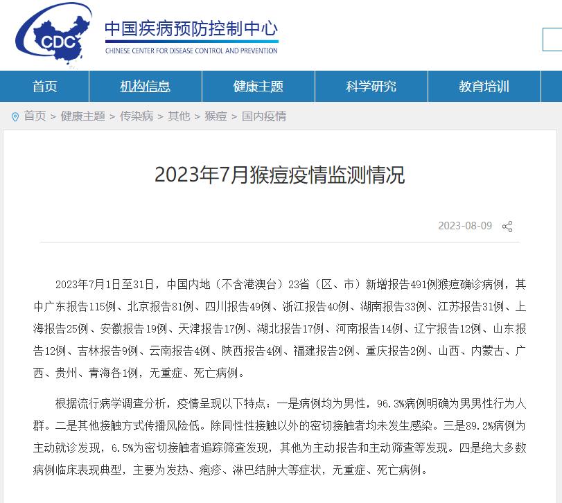 中疾控:7月中國內地新增報告491例猴痘確診病例分享到: