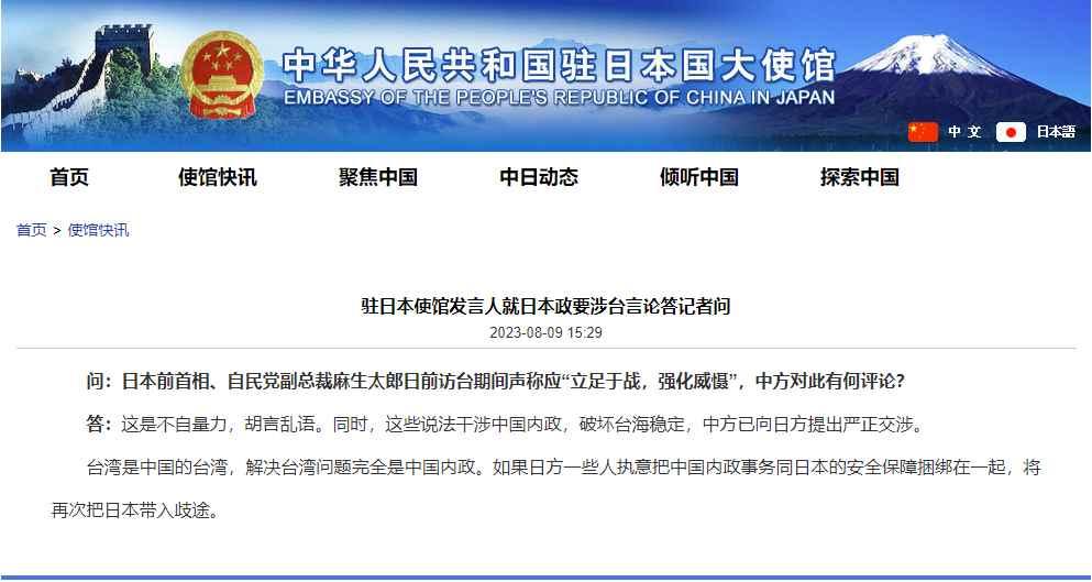 中方駁斥麻生太郎涉台言論:不自量力,胡言亂語