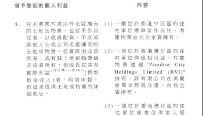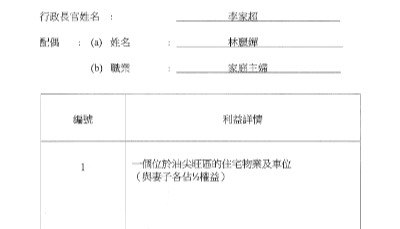 (香港中通社資料圖) 政府表示,行政長官的個人利益申報資料已上載行政長官辦公室網頁。各司長、副司長和局長,以及行政長官辦公室主任按《政治委任制度官員守則》提交的利益申報資料亦已上載相關辦公室或政策局的網頁。至於行政會議成員(包括主席及各官守議員和非官守議員)的個人利益申報資料,已上載行政會議的網頁。 《政治委任制度官員守則》訂明,各政治委任官員在委任之初及其後每年須申報其投資及利益,並將申報資料上載相關辦公室或政策局的網頁。行政長官自願跟從上述申報安排。至於行政會議成員同樣須在委任之初及其後每年申報須予登記的個人利益,申報資料會上載行政會議的網頁。(完) 【編輯:刘春】