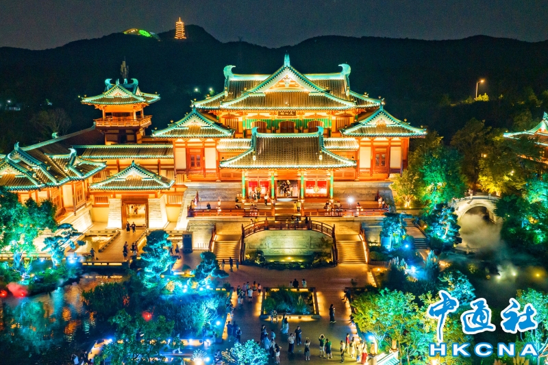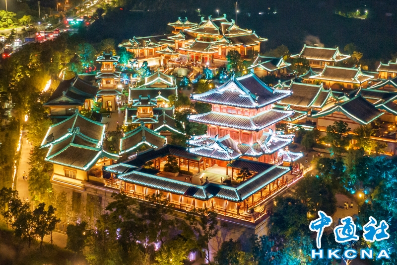 •   8月10日晚,江蘇南京,航拍位於牛首山文化旅遊區的金陵小城·燕集里,流光溢彩再現金陵(南京古稱)盛景。 香港中通社圖片