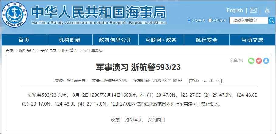 香港新聞網8月11日電 據浙江海事局8月11日消息, 浙航警593/23 東海, 8月12日1200至8月14日1600時,在(1)29-47.0N,123-27.0E(2)29-47.0N,124-48.0E(3)29-17.0N,124-48.0E(4)29-17.0N,123-27.0E四點連線水域範圍內進行軍事演習,禁止駛入。