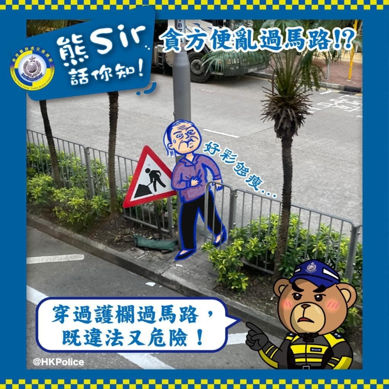 警方呼籲勿亂過馬路。警方FB圖片 而根據《道路交通(交通管制)規例》及《道路交通條例》,以下情況均屬違例,包括:(一)在交通燈控制的過路處的15米範圍內,但卻不使用交通燈控制的過路處過馬路;(二)在距離行人天橋或行人隧道或該天橋或隧道的任何部分的15米範圍內,但卻不使用該天橋或隧道過馬路;攀越或穿過任何路邊圍欄或中央分道帶過馬路;在紅色燈號亮着時,在有關過路處橫過或開始橫過車路;任何使用道路的行人疏忽地危害其本人或他人的安全。 交通總部道路安全課高級督察陳浩文早前表示,香港今年首兩季共發生53宗致命交通意外,為近3年來最高。當中造成38名行人死亡,包括23名65歲或以上長者。單是7月份已經發生8宗致命交通意外。他指出,相比司機、乘客及騎單車人士,行人在交通意外中最容易受傷,主要由於沒有遵守交通信號燈過馬路、走路不專心,以及沒有使用過路設施等。(完) 【編輯:孟宜君】