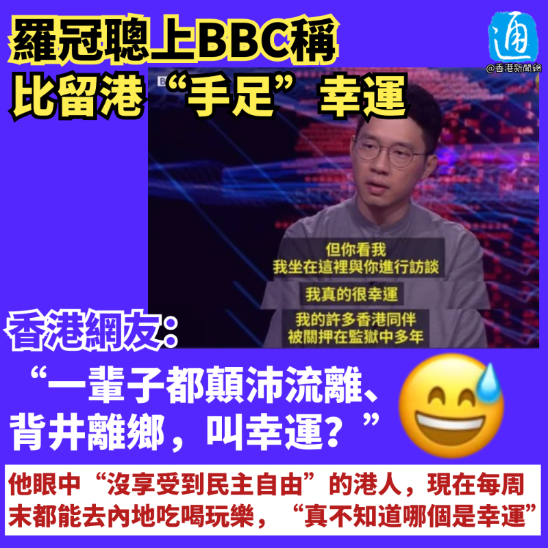 羅冠聰上BBC稱比留港“手足”幸運,被網友揭下遮羞布香港新聞網8月17日電 被香港保安局局長鄧炳強形容為“現代漢奸”的國安通緝犯羅冠聰,日前接受英國廣播公司(BBC)的訪問,承認相比被捕入狱的香港“手足”,自己算是“很幸运”,結果立刻被一眾網友揭下了遮羞布……