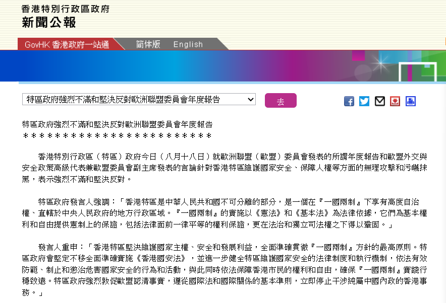 香港新聞網8月19日電 香港特別行政區(特區)政府昨(18日)晚間發表聲明,就歐洲聯盟(歐盟)委員會發表的所謂年度報告和歐盟外交與安全政策高級代表兼歐盟委員會副主席發表的言論針對香港特區維護國家安全、保障人權等方面的無理攻擊和污衊抹黑,表示強烈不滿和堅決反對。