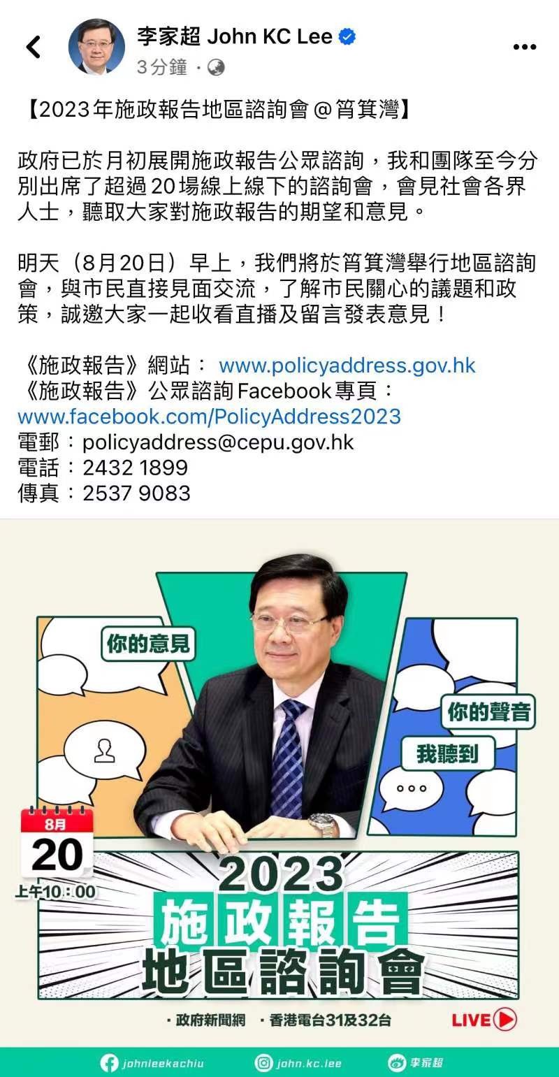 李家超說,明天(8月20日)早上,政府團隊將於筲箕灣舉行地區咨詢會與市民直接見面交流,瞭解市民關心的議題和政策,并誠邀大家一起收看直播及留言發表意見。