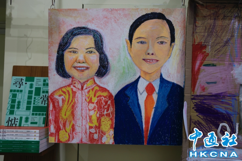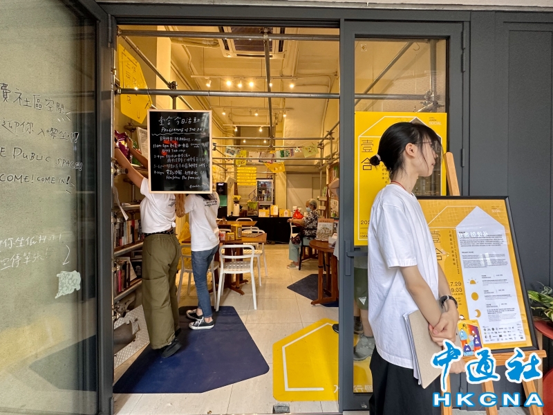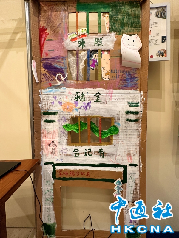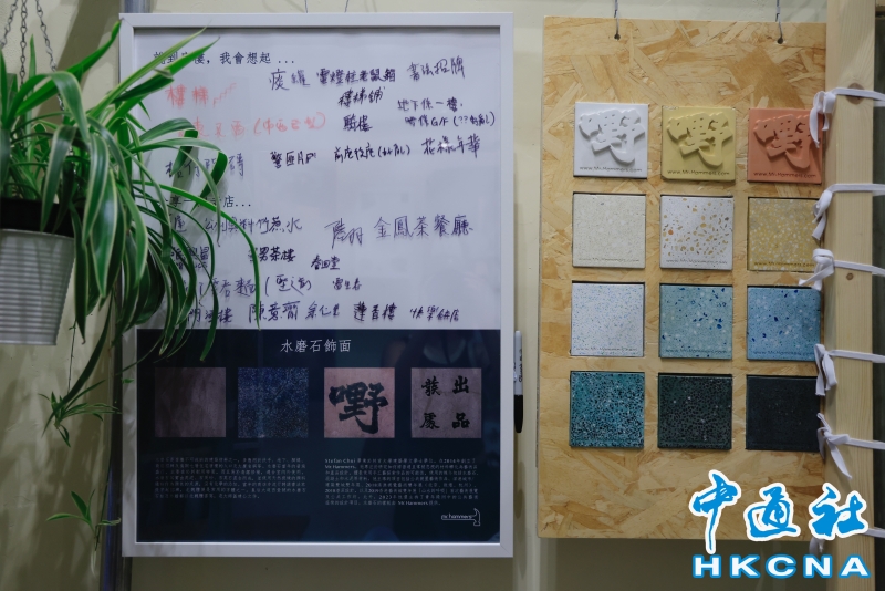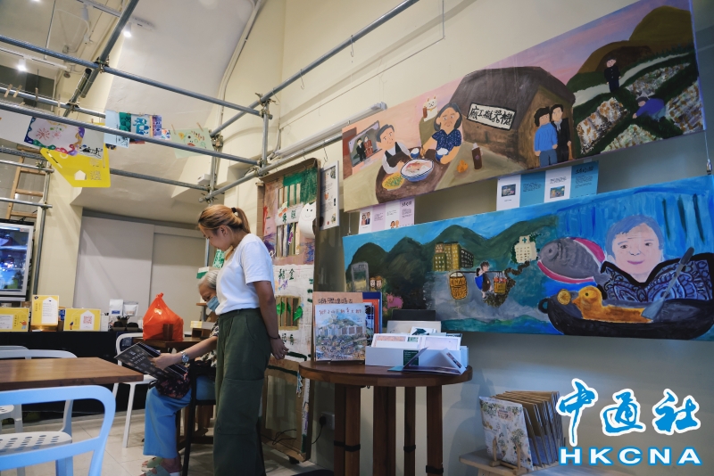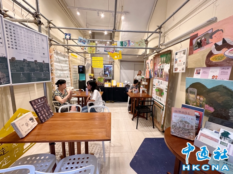香港上環皇后大道西及文咸東街交街處,有一座戰前直角轉角唐樓——“有記合”,約於1913至1926年間建成,己有近百年歷史。唐樓樓高4層,具有新古典主義建築特色,並於2010年被列為香港三級歷史建築。外牆的“有記合”、“金豬”及“臘味”等字樣、“有記合臘味家”水磨石招牌,以及石柱上由書法家區建公提字的北魏體廣告字,別具特色。近日,“有記合”化身社區空間“壹合”,連續5星期開放,並舉辦一系列活動,包括社區咖啡店、社區客廳、即傾Talk Show、電影沙龍、二手衫快閃點、水磨石筆座、實驗版畫工等,供市民參與。圖為社區空間內佈置插畫。(香港中通社記者 曹文毓攝) 香港中通社圖片