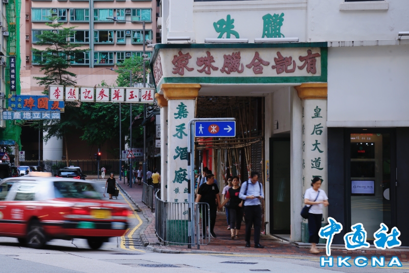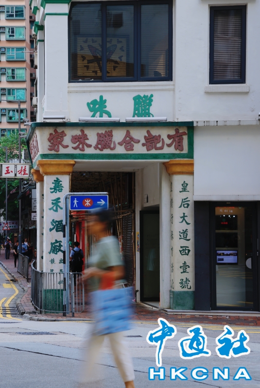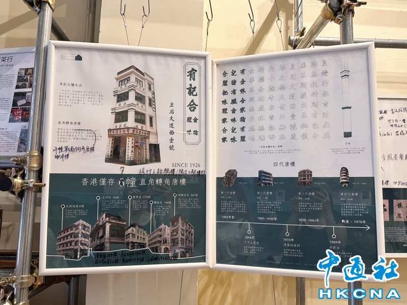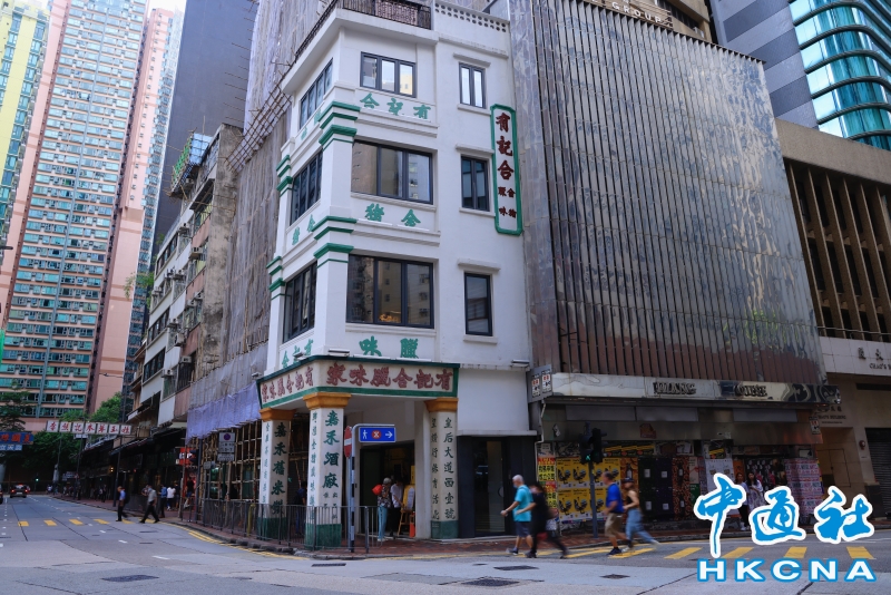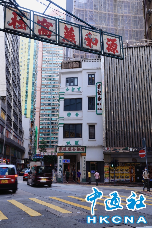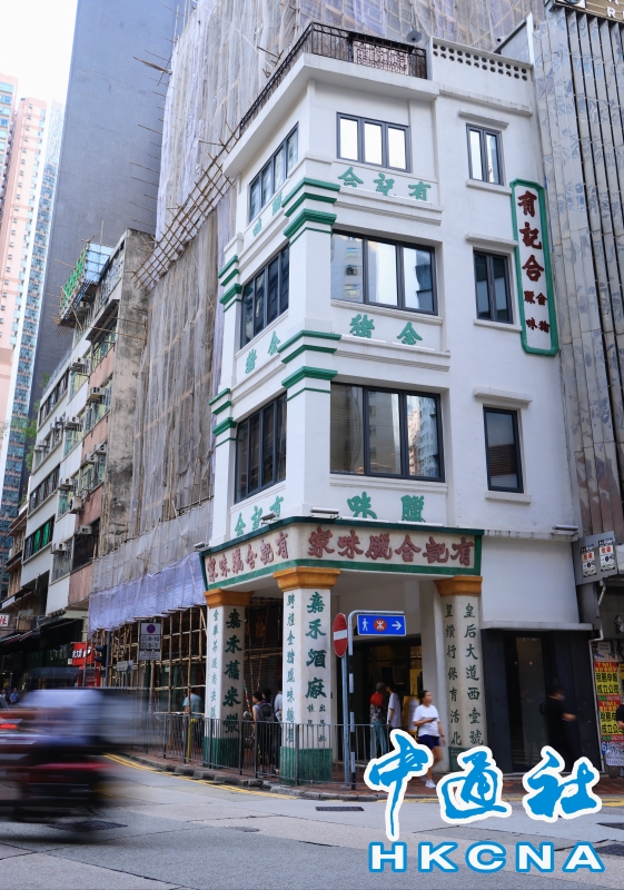 香港上環皇后大道西及文咸東街交街處,有一座戰前直角轉角唐樓——“有記合”,約於1913至1926年間建成,己有近百年歷史。唐樓樓高4層,具有新古典主義建築特色,並於2010年被列為香港三級歷史建築。外牆的“有記合”、“金豬”及“臘味”等字樣、“有記合臘味家”水磨石招牌,以及石柱上由書法家區建公提字的北魏體廣告字,別具特色。近日,“有記合”化身社區空間“壹合”,連續5星期開放,並舉辦一系列活動,包括社區咖啡店、社區客廳、即傾Talk Show、電影沙龍、二手衫快閃點、水磨石筆座、實驗版畫工等,供市民參與。(香港中通社記者 曹文毓攝) 香港中通社圖片