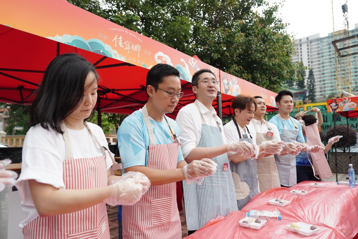 陳局長和黃專員與馬會長及陳主任一同到佳寧娜攤位製作月餅