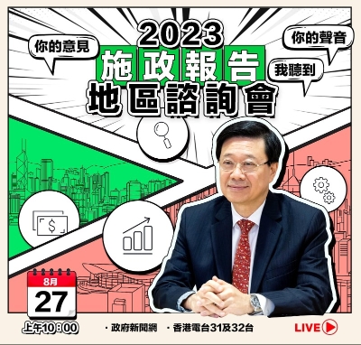 李家超出席2023年《施政報告》地區諮詢會。直播畫面截圖 一同出席今次地區諮詢會的司局級官員共有21位,包括政務司司長陳國基、財政司司長陳茂波、律政司司長林定國資深大律師、政務司副司長卓永興、財政司副司長黃偉綸、律政司副司長張國鈞、文化體育及旅遊局局長楊潤雄等。 在諮詢會上,有市民關注香港經濟問題、地區問題等。其中有市民提及,通關後不少市民北上消費,香港入夜後商場及街上人流大減,希望特區政府正視問題。李家超表示,香港在短期方面要“搞活夜市”,達致經濟效益,特區政府會積極推動相關活動;而在長遠方面需要優化旅遊業,因應遊客改變旅遊習慣,要推動特色路線,包括文化、美食、古蹟等。他強調,特區政府會繼續對外推廣香港,又預告新一份施政報告將有關於人才及旅遊等政策推出。 至於地區問題方面,李家超指出,地區問題多變,每區的處理方法都不同,但在完善地區治理體系後能夠統籌不同政府部門處理地區問題。加上未來新組成的區議會,以及地區治理專隊的兩個組織,相信相關措施能夠落實得更到位。另外,李家超回應房屋發展方面時,指出特區政府已經縮短建屋流程,但仍然需要一段時間,已經透過發展過渡性房屋及簡約公屋,應付緊急房屋需求。而未來亦有大量的規劃工作,包括發展交椅洲人工島。 李家超表示,他與團隊在今日的地區諮詢會中與市民有很好的交流,很有收獲,聽取了不同的寶貴意見。也深深感受到大家對香港這個家園的深厚感情,和對共建更美好香港的熱切期盼。為市民解決日常生活遇到的問題,讓市民過得幸福,是他和團隊的責任,也是他們共同奮鬥的目標。
