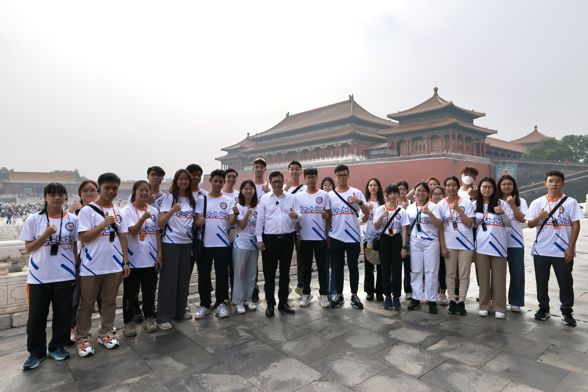 鄧炳強(前排中)與青年學員參觀故宮博物院,觀賞各式珍貴文物及其建築特色。圖自香港特區政府新聞處 參訪團其後參觀故宮博物院,觀賞各式珍貴文物及其建築特色;20日下午到訪圓明園遺址公園,觀賞包括海晏堂大水法等古跡和結合中西文化的造園風格,并瞭解列強入侵燒毀圓明園的傷痛歷史,和體會到國家要強大,必定要發揮自強不息的奮鬥精神。