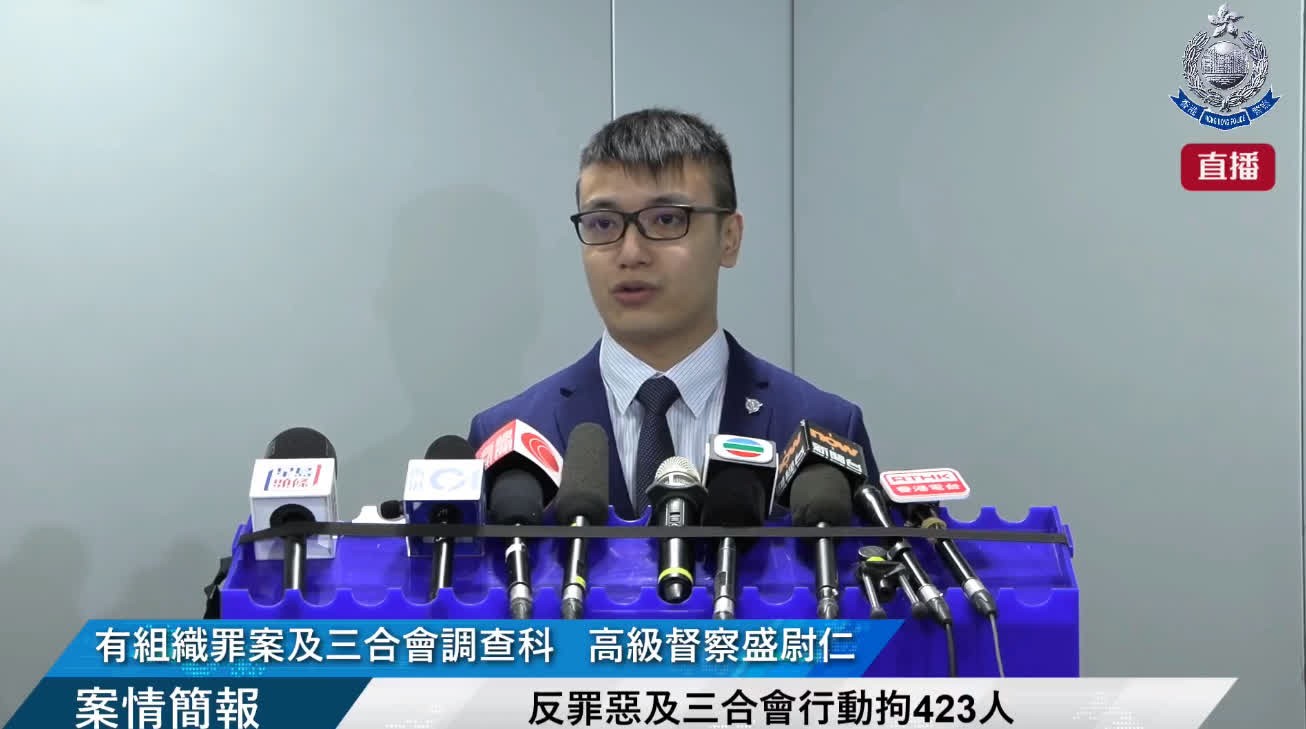 香港警方指,行動中搗破多個非法賭場、毒窟、無牌按摩院及酒吧並拘捕423人。直播截圖 行動中,香港警方檢獲約13萬現金、一批約市值300萬的毒品,包括1.9公斤可卡因、1.5公斤冰毒及其他毒品、大批賭博工具及武器,當中包括4把刀及一支伸縮棍。 警方有組織罪案及三合會調查科高級督察盛尉仁表示,至19日行動合共拘捕423人,包括281名男子及142名女子,年齡介乎16至93歲,當中包括81名非華裔人士,涉嫌傷人、襲擊至身體造成傷害、藏有攻擊性或違禁武器、非法集結、刑事毀壞、販運及藏有危險藥物、經營毒窟、以欺詐手段獲得財產、洗黑錢、經營非法賭場及按摩院、非法入境以及違反逗留條件被捕。被捕人當中,93歲被捕女子涉及一宗於長洲非法賭場內賭博案件。 香港警方重申,打擊三合會、犯罪集團及有組織罪行是警務處處長首要行動項目之一。香港警方絕不容忍涉及三合會的非法活動,會不遺餘力繼續以情報主導的行動全力打擊三合會及堵截其收入來源。(完) 【編輯:許豐悅】