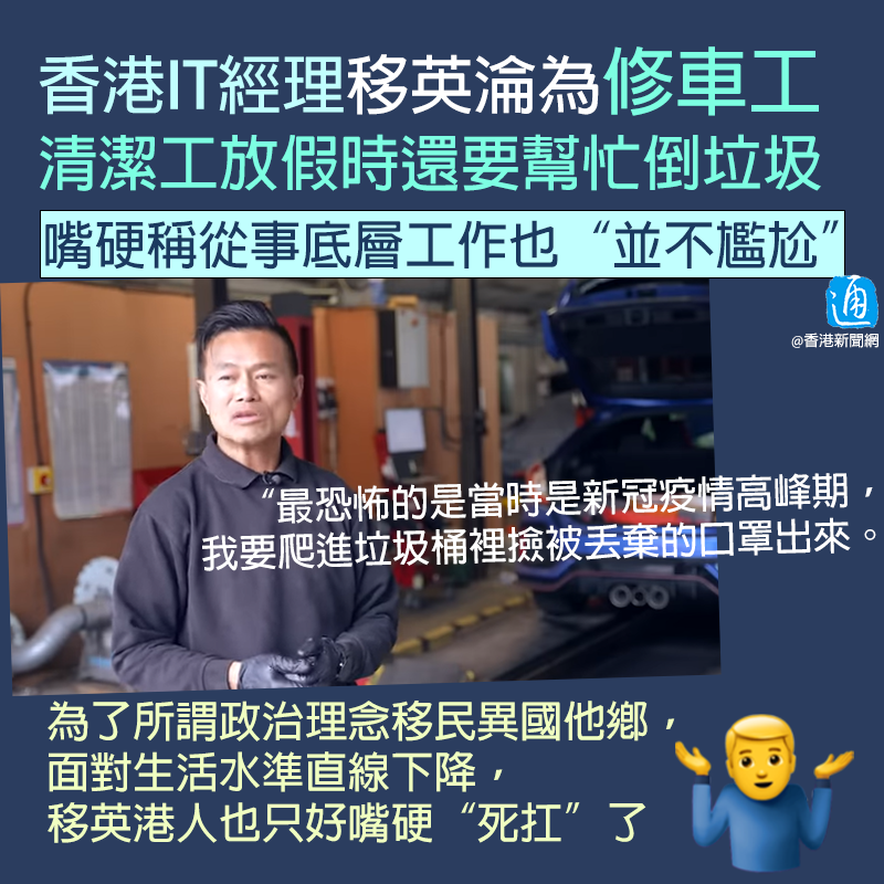 香港新聞網8月21日電 部分“黃絲”港人放棄高薪厚職移居英國後,發現自己只能從事底層工作,為了生活甚至還要撿垃圾……面對如此落差,他們只好自我安慰:“這是在開啟第二人生!” 近日,有網媒上傳視頻,介紹移英港人Pierre的近況,宣揚在英做底層工作“並不尷尬”。 視頻中了解到,Pierre原先在香港做IT經理,行情好的時候年薪可以達到70多萬港幣,屬於生活富足的香港中產。三年前,四十幾歲的他移居英國,求職優勢不在,只好從貨倉工作做起,後來又到車房做維修工人。 回顧在英工作歷程,Pierre坦承最辛苦的不是體力上的,而是心理上的,“因為體力是可以逼出來的。”憶述在貨倉工作時,有一次清潔工放假,倒垃圾的工作甚至也要由他來完成,但那個巨大的垃圾桶其實需要兩個人才能清理。 “最恐怖的是當時是新冠疫情高峰期,我要爬進垃圾桶裡撿被丟棄的口罩出來。”那段經歷令Pierre至今心有餘悸,他坦言“那刻心裡真的哭了出來……” 儘管當下非常委屈,但Pierre認為自己“別無選擇”,只能硬撐,“你不做就會有另一個人做,不做就會被淘汰。” 談及在香港時的工作,Pierre則不由地面露笑容,形容“非常悠閒”,每天上班幾個小時,“若那天陽光普照,便下班去踩單車;若下雨太冷,就留在家裡工作。” 在香港過慣好日子為何還要赴英?視頻中,Pierre暴露“黃絲”本性,聲稱2019年香港發生“修例風波”後,令他感覺“香港不再是香港”,“面對指鹿為馬的社會,我做不到。”於是離港赴英。 但Pierre沒料到的是,抵英後找工作非常困難,他只好自我安慰、自我麻痺,稱自己過得“開心”,從事底層工作也“並不尷尬”,在英從零開始讓他覺得好似開啟“第二人生”。並為自己挽尊,稱“基層工作做不好,一生也攀不到更高位置”。