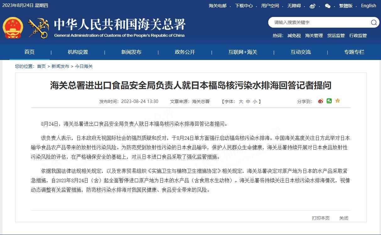 該負責人表示,日本政府無視國際社會的強烈質疑和反對,於8月24日單方面強行啟動福島核污染水排海。中國海關高度關注日方此舉對日本輸華食品農產品帶來的放射性污染風險。為防範受到放射性污染的日本食品輸華,保護人民群眾生命健康,海關總署持續開展對日本食品放射性污染風險的評估,在嚴格確保安全的基礎上,對從日本進口食品採取了強化監管措施。 依據中國法律法規相關規定,以及世界貿易組織《實施衞生與植物衞生措施協定》相關規定,海關總署決定對原產地為日本的水產品採取緊急措施,自2023年8月24日(含)起全面暫停進口原產地為日本的水產品(含食用水生動物)。海關總署將持續關注日本核污染水排海情況,視情動態調整有關監管措施,防範核污染水排海對中國民健康、食品安全帶來的風險。 【編輯:丘志彬】