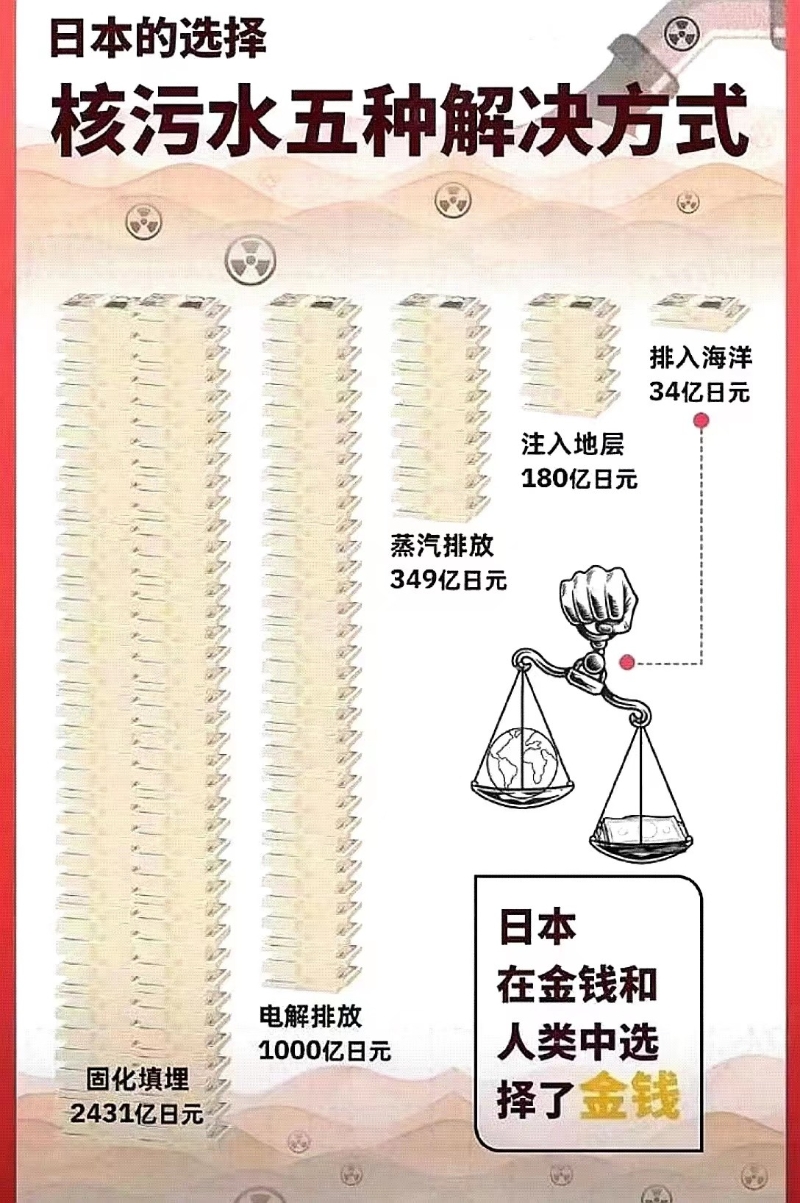 圖片來源於網絡 日本為何一定要將核污染水排海? 第一個原因,因為其他的處理方式“太貴了”。事實上,日本有多種方式處理這些核污染水,福島核事故發生後,各國專家便陸續提出了5種解決方案,除了向海洋排放核污染水外,地層注入、蒸汽排放、電解釋放和固化填埋都是可行選項。然而,日本政府選擇了他們認為最“劃算”的方式。