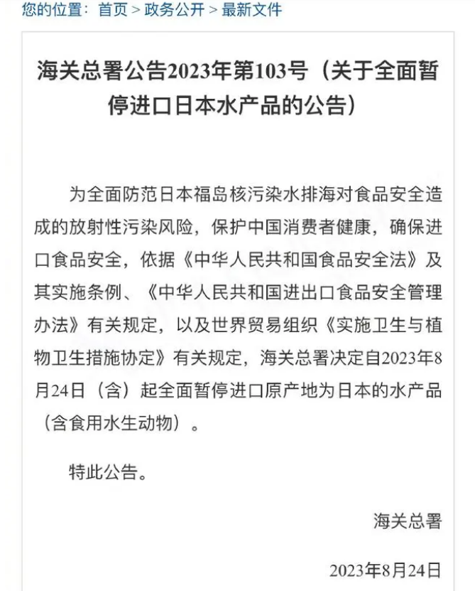 (香港中通社資料圖) 民建聯表示,充分認同國家海關總署的決定,促請特區政府與國家保持相對一致的食品入口要求,按國家的做法及實際情況,調整進口禁令,避免香港成為國家食安的風險點。並譴責日本政府堅持與國際為敵,單方面亂排核污水,要求日方立即停止不負責任的行為。 工聯會亦要求特區政府即時全面禁止日本水產品進口,並對日本排放核污水表示憤慨和強烈反對。指日方做法違反科學,極端不負責任,應立即停止。 8月24日,中國海關總署官網發布關於全面暫停進口日本水產品的公告。 公告稱,為全面防範日本福島核污染水排海對食品安全造成的放射性污染風險,保護中國消費者健康,確保進口食品安全,依據《中華人民共和國食品安全法》及其實施條例、《中華人民共和國進出口食品安全管理辦法》有關規定,以及世界貿易組織《實施衛生與植物衛生措施協定》有關規定,海關總署決定自2023年8月24日(含)起全面暫停進口原產地為日本的水產品(含食用水生動物)。