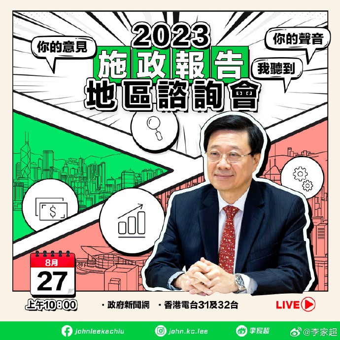 香港新聞網8月26日電 行政長官李家超今日(26日)在社交平台發文指,明早將於沙田舉行第二場施政報告地區諮詢會,聽取市民的意見和建議,歡迎市民收看直播及留言發表意見。
