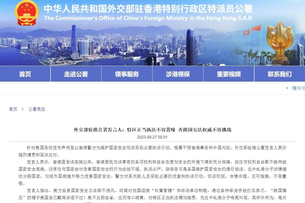 香港中通社8月27日電 針對美國務院發布聲明妄議香港警方為維護國家安全依法採取必要執法行動,粗暴干預香港事務和中國內政,外交部駐港公署發言人27日表示強烈譴責和堅決反對。