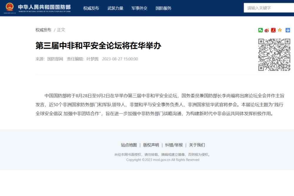 中國國務委員兼國防部長李尚福將出席論壇全會並作主旨發言,近50個非洲國家防務部門和軍隊領導人、非盟和平與安全事務負責人、非洲國家駐華武官將參會。