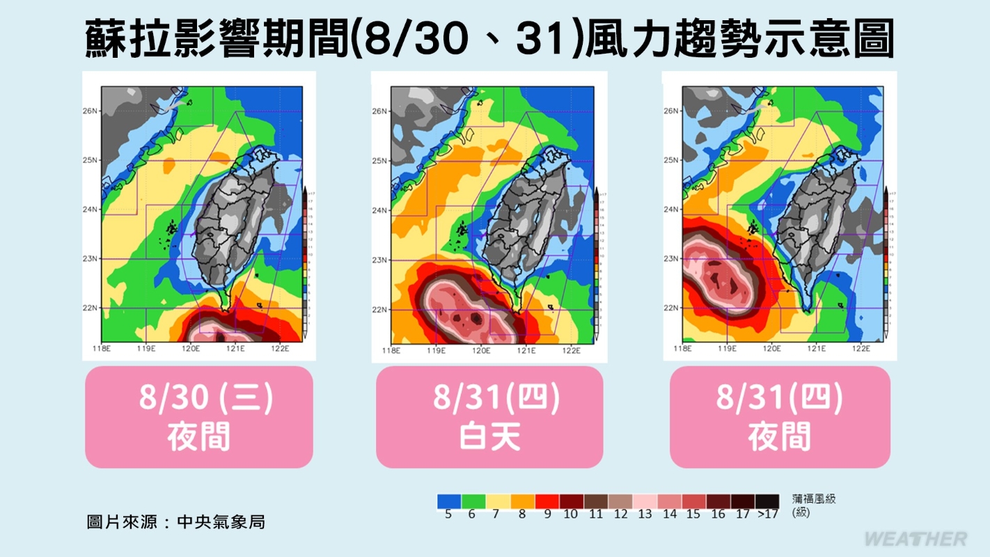蘇拉颱風風力趨勢圖。圖源:台灣“中央氣象局” 第9號颱風-蘇拉: 30日-31日靠近台灣、暴風圈將掠過南台灣。台灣花東及恆春半島是距離颱風最近的地區。到了9月1日,蘇拉就會逐漸遠離。 第10號颱風-丹瑞: 目前丹瑞颱風位於日本東方海面,不會影響台灣。 第11號颱風-海葵: 目前海葵颱風則是位台灣東方約兩千多公里遠的海面上發展中,將有機會於本周末靠近到日本琉球群島一帶,需要繼續觀察。(完) 【編輯:王軼南】