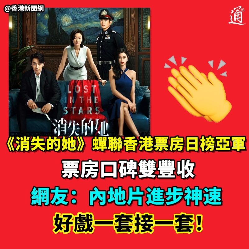 (香港討論區截圖) 《消失的她》由陳思誠監製、編劇,內地演員朱一龍、倪妮,及香港演員文咏珊領銜主演。 影片聚焦一宗妻子失蹤迷案,何非(朱一龍 飾)的妻子李木子在結婚周年旅行中突然消失,看似深情的丈夫瘋狂找尋妻子無果,突然在某個清晨發現身邊躺著一名陌生女子(文咏珊 飾)。該女子聲稱自己便是他的妻子李木子,由此展開故事的多重反轉。 該片6月底在內地公映後,掀起觀影熱潮。8月14日,《消失的她》官方微博宣布影片將延長上映至9月21日,現時,該片累計票房已達35.2億,暫列今年暑期檔票房冠軍。而在香港觀眾的支持下,該片票房有望持續攀升。