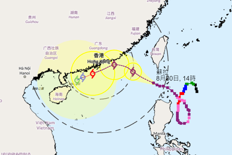 香港天文台圖片。 天文台表示,按照現時預測路徑,“蘇拉”在今晚至明早仍與本港維持超過300公里距離,一號戒備信號會在明日中午前維持。隨著“蘇拉”靠近廣東東部沿岸,該區風勢會逐漸增強,天文台明日稍後會改發三號強風信號。天文台預料「蘇拉」會在星期五(9月1日)至星期六(9月2日)頗為接近珠江口一帶,香港會有狂風驟雨,風勢進一步增強。隨後“蘇拉”可能受東北季候風及熱帶氣旋「海葵」影響,其路徑及強度仍有變數。另外,天文台提醒海面有湧浪,市民應遠離岸邊及停止所有水上活動。 根據天文台網站最新的預測路徑顯示,“蘇拉”會在明天(31日)以超強颱風的強度逼近香港400公里範圍,並在周五(9月1日)至周六(9月2日)最接近香港。
