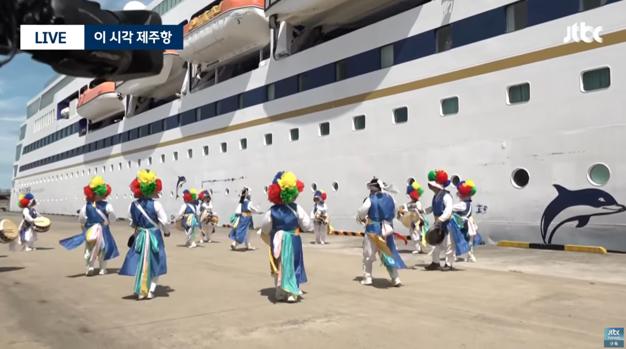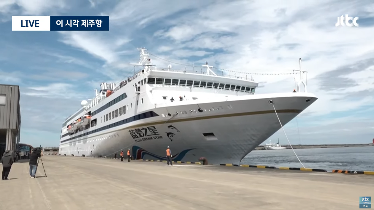時隔6年多首艘自華出發郵輪31日靠泊濟州。圖源:韓國JTBC電視台 報道稱,“藍夢之星”號郵輪(噸位2.4782萬噸,載客量1275人)當天下午2時許駛入濟州港。這是中國郵輪自2017年“薩德入韓”問題發酵後時隔6年零5個月再次造訪濟州,也是中國開放公民赴韓團隊游後的首艘來韓郵輪。