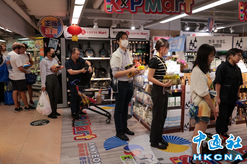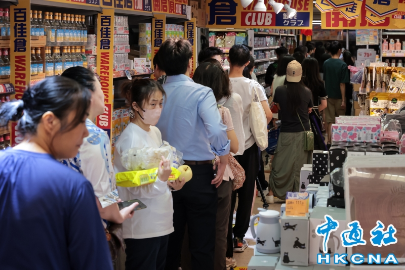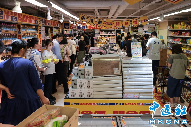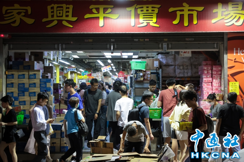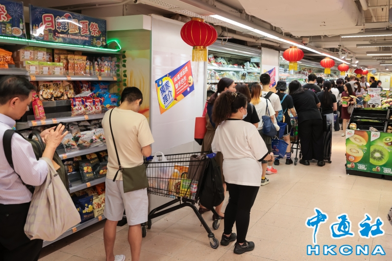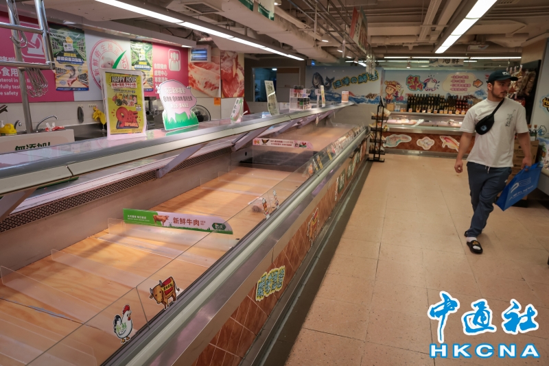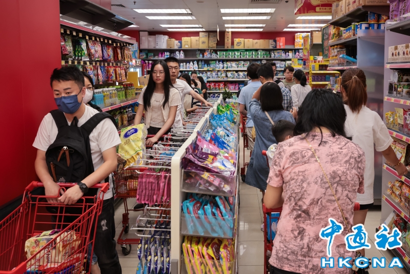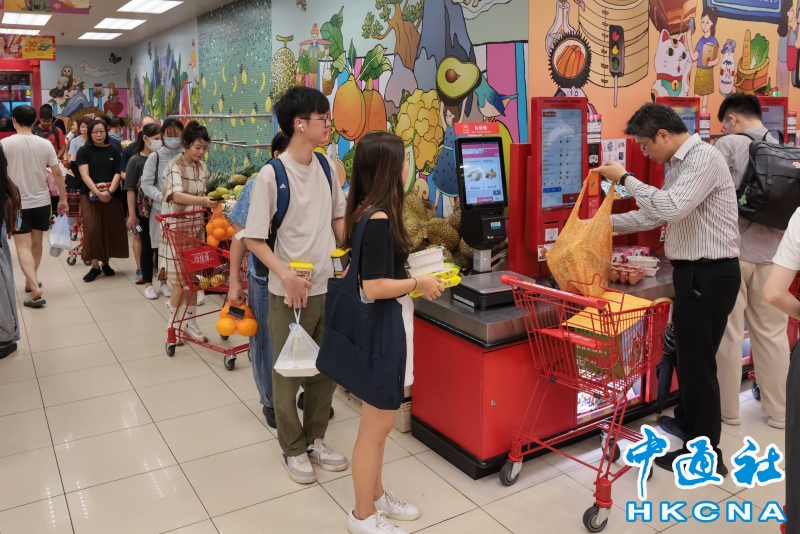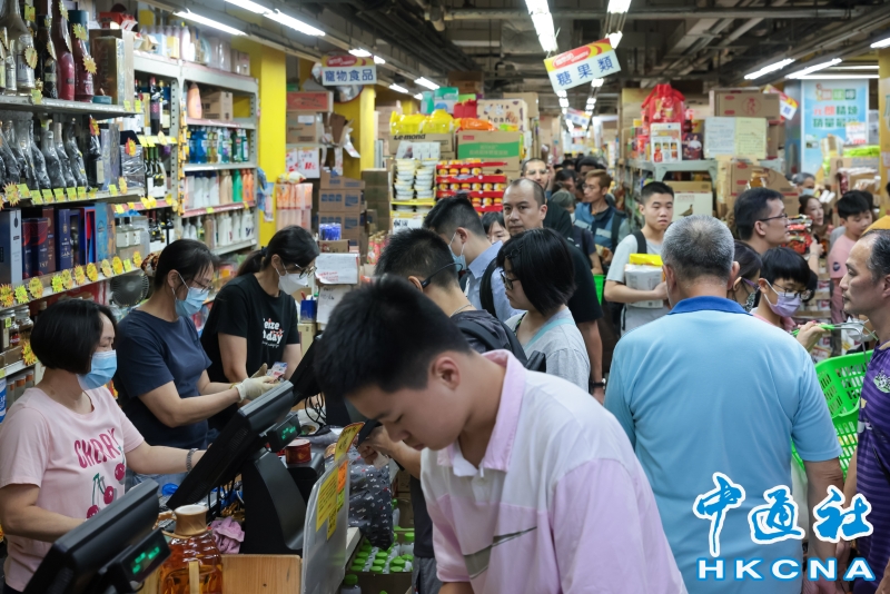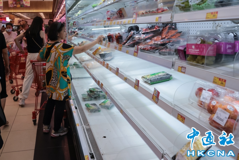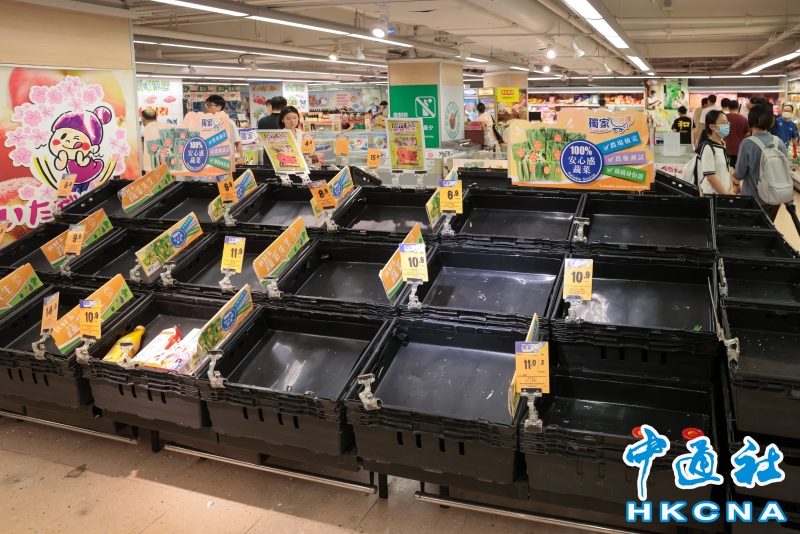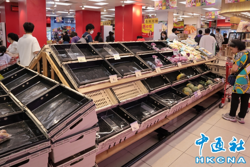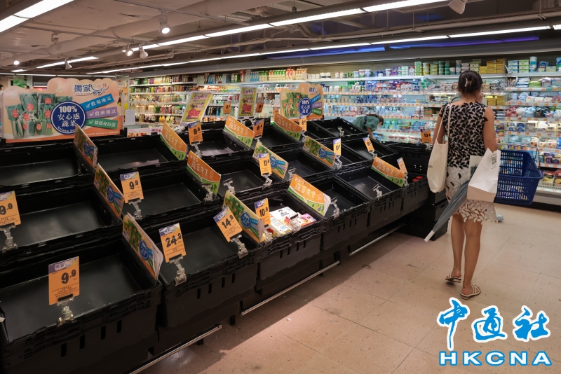 隨著超強颱風“蘇拉”逼近,香港天文台預告會在明天(9月1日)凌晨2時至5時改發八號風球。8月31日,香港超市再現搶購潮,新鮮蔬菜、麵包和冰鮮肉貨架幾乎被搶購一空,僅有少量供選擇,等候結賬的市民也排起長龍。(香港中通社記者 謝光磊 攝) 香港中通社圖片