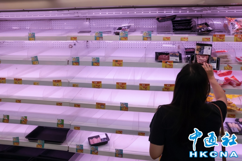 隨著超強颱風“蘇拉”逼近,香港天文台預告會在明天(9月1日)凌晨2時至5時改發八號風球。8月31日,香港超市再現搶購潮,新鮮蔬菜、麵包和冰鮮肉貨架幾乎被搶購一空,僅有少量供選擇,等候結賬的市民也排起長龍。圖為市民也用手機紀錄下空空的貨架。(香港中通社記者 謝光磊 攝) 香港中通社圖片