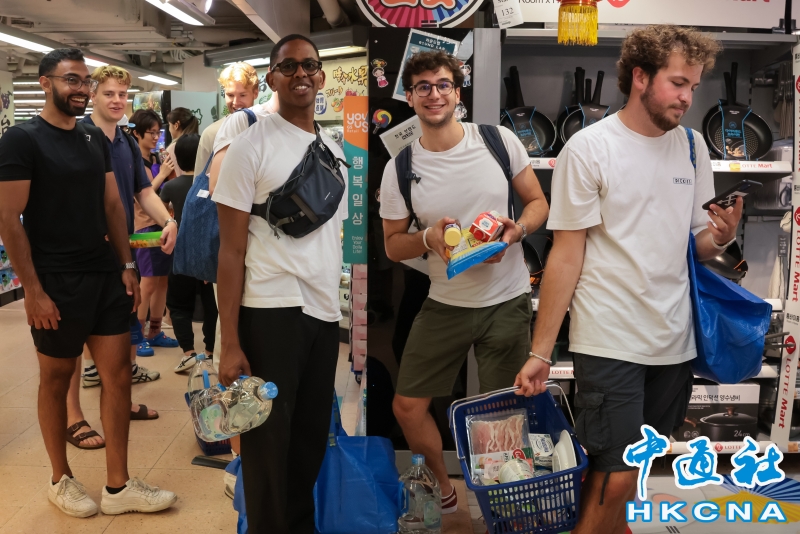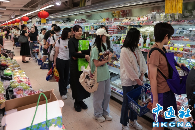 隨著超強颱風“蘇拉”逼近,香港天文台預告會在明天(9月1日)凌晨2時至5時改發八號風球。8月31日,香港超市再現搶購潮,新鮮蔬菜、麵包和冰鮮肉貨架幾乎被搶購一空,僅有少量供選擇,等候結賬的市民也排起長龍。圖為外國留學生也加入搶購大軍。(香港中通社記者 謝光磊 攝) 香港中通社圖片