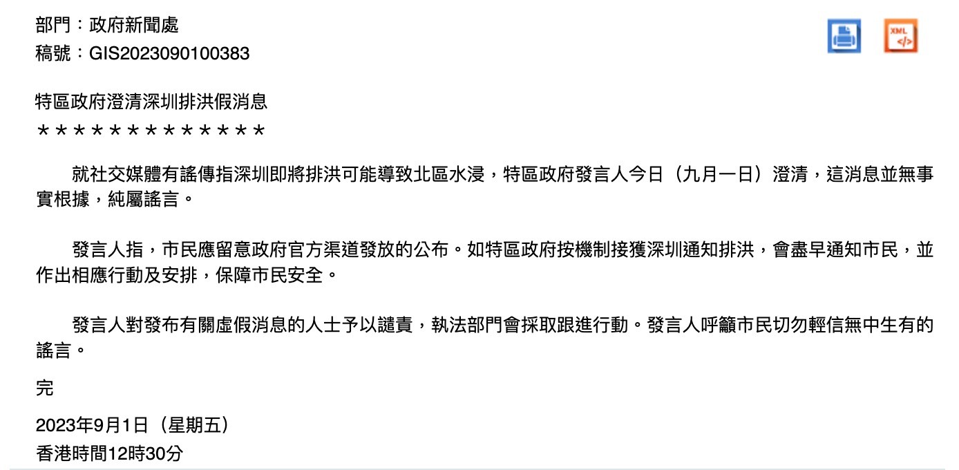香港新聞網9月1日電  就社交媒體有謠傳指深圳即將排洪可能導致北區水浸,特區政府發言人9月1日澄清,這消息並無事實根據,純屬謠言。