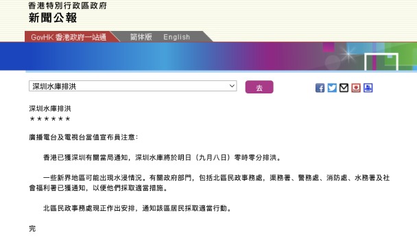 發言人指,市民應留意政府官方渠道發放的公布。如特區政府按機制接獲深圳通知排洪,會盡早通知市民,並作出相應行動及安排,保障市民安全。