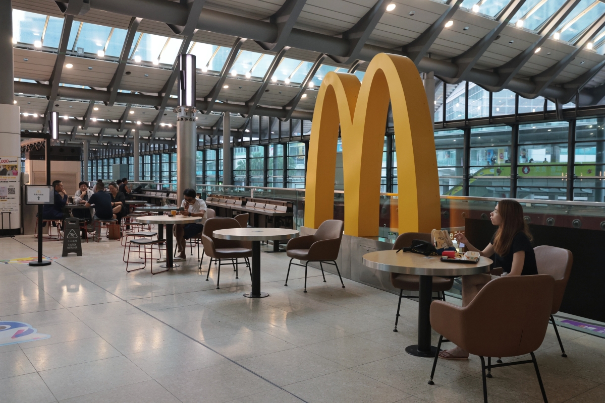 香港中通社記者 謝光磊 攝 強風下,不少連鎖食店都照常營業。有市民在麥當勞光顧用餐。