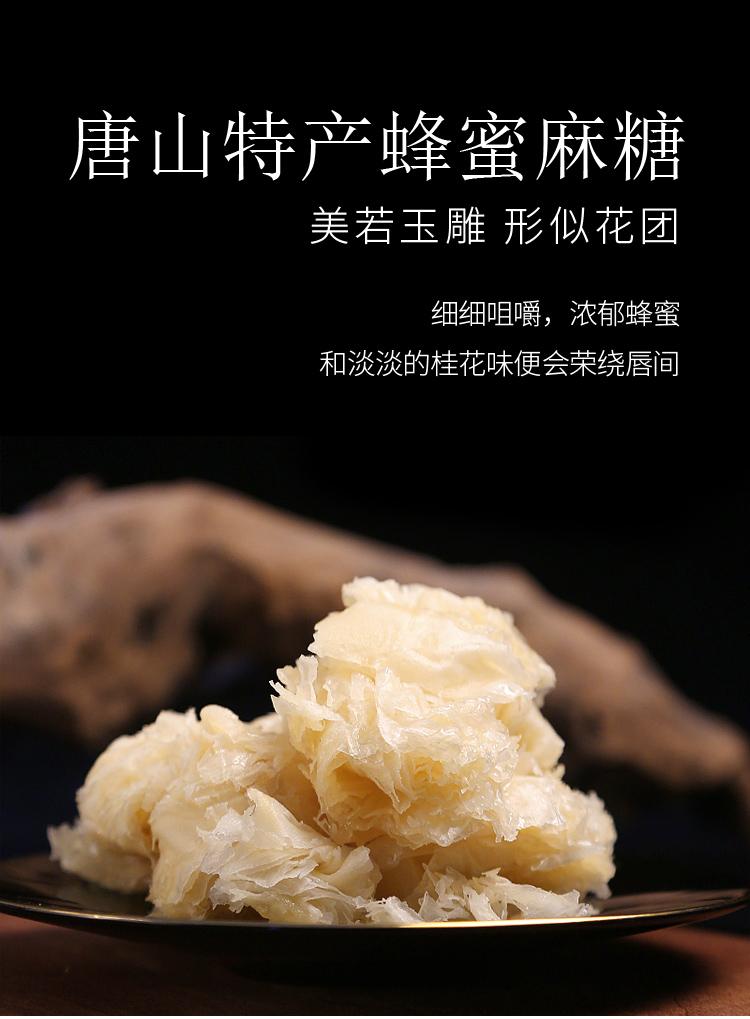 萬里香燒雞。圖源:互聯網 >>【蜜糖麻糖】唐山蜜糖麻糖是唐山的傳統名小吃,人稱“糕點中的一枝花”、“甜蜜的非遺”、“麻糖大王”,是唐山市的一道傳統名點,流傳至今至少有400多年曆史了,這種麻糖美如玉雕,外形就像一朵淡黃色的花,片薄如紙,入口清香甜脆,片片香酥。