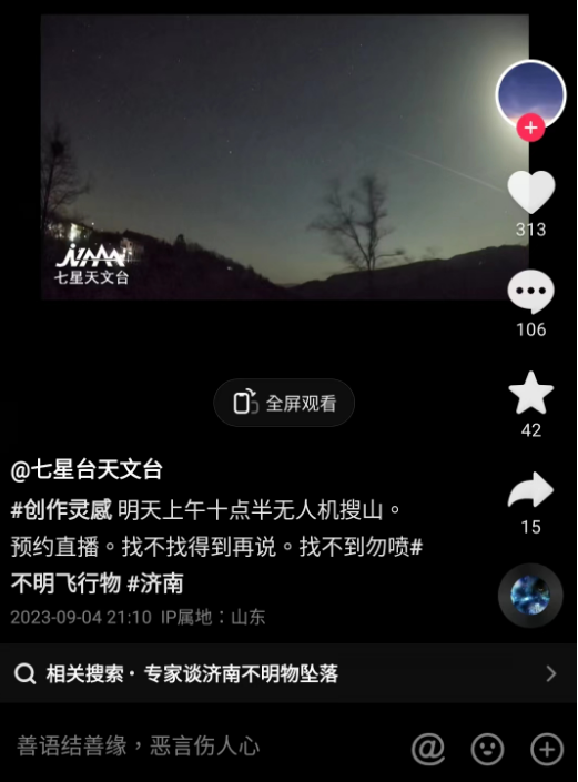七星台天文台抖音截圖 9月1日晚,上海天空突然出現一個不明飛行物,如火球般高速墜落。據拍攝者李先生稱,它呈下落狀態,不像是飛機,顔色明顯很亮很紅。有點像孫悟空的筋斗雲。對此,中國氣象局公共氣象服務中心在官方微博發文,稱像是“飛機的尾跡雲”;上海市氣象局也推測,可能是尾跡雲擴散後形成的。