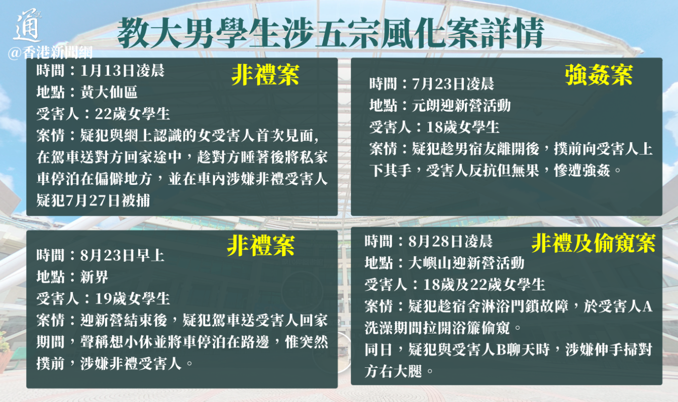 警方交代案情。警方臉書影片截圖 校方:若查明屬實 將啓動懲處程序 對此,香港教育大學表示,案件已進入刑事調查階段,校方不宜作出具體評論,但強調大學不是法外之地,所有大學持份者必須守法。校方不會容忍任何違法行為,若查明屬實,將啓動懲處程序,絕不姑息。 這次的風化案涉及到香港的兩所大學:香港大學,香港教育大學。 而疑犯就只有兩人,分別是20歲姓鄧的香港大學男學生,以及28歲姓嚴的香港教育大學男學生。其中,姓嚴的教大男學生,一個人就已經犯下4宗案件。 香港教育局就指出,非常關注近日涉及大學迎新營活動的個案,強調對學生違法違紀及欺凌行為“零容忍”。由於個案進入司法程序,教育局不便評論,但已經明確要求相關大學嚴肅處理迎新營活動的學生投訴,並配合執法機構的調查。若發現投訴屬實,大學必定按機制採取紀律行動,嚴重者可被開除學籍。 發言人又重申,社會各界對大學生的行為和操守有所期望,大學生必須遵紀守法,持守正面價值觀、實踐良好品德行為,自尊、自愛、自強,成為德才兼備,具個人素養的良好公民。大學亦應加強培養學生品德的工作,並確保迎新營活動在合法、安全及參與者互相尊重的前提下進行。