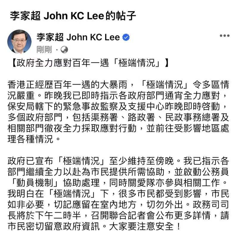 李家超社交媒體截圖。 李家超在推文中指,昨晚他已即時指示各政府部門通宵全力應對,保安局轄下的緊急事故監察及支援中心昨晚即時啟動。多個政府部門,包括渠務署、路政署、民政事務總署及相關部門徹夜全力探取應對行動,並前往受影嚮地區處理情況。政府已宣布“極端情況”至少維持至傍晚。 李家超再次提醒,極端情況下,很多市民都受到影嚮,市民如非必要,切記應留在室內地方,切勿外出。政務司司長將於下午二時半,召合記者公佈更多群情。 (完) 【編輯:王軼南】