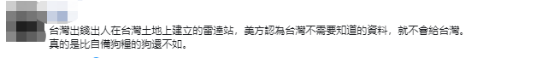 據台媒此前報道,蔡英文曾於2020年10月13日視頻位於新竹樂山的遠程預警雷達站,在台灣軍方公佈的照片中出現了一位美方人員,這是民進黨當局首度公開美方人員進駐樂山站。 台空軍當時稱,樂山陣地的雷達系統,是台灣循軍售向美國采購的高科技裝備,美籍人士系依台灣方面需求,由美國原廠依合約派遣專業技術代表提供維修服務,協助系統順利運作。當時,美國雷神公司前在台總經理胡振東也稱此人不是美軍,是他的副手,在那邊做訓練。 對於胡振東的說法,有島內網民質疑,“在那邊服役過的幹部都知道:設備的錢我們花、技術人員也花我們的錢養,但第一手資料卻是美國佬拿走,再看心情施捨給看門狗。” 一段時間以來,美方在售台武器、加強美台軍事聯繫方面消極動作不斷,加劇了台海局勢緊張。國台辦發言人此前曾強調,我們堅決反對美國同中國台灣地區進行任何形式的官方往來和軍事聯繫。希望廣大台灣同胞擦亮眼睛,堅決反對“台獨”分裂勢力勾連外部勢力毀台、害台的行徑。(完) 【編輯:許豐悅】