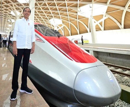 香港新聞網9月14日電 印尼總統佐科13日考察中印尼合作項目雅萬高鐵,在首都雅加達哈利姆站乘坐高鐵列車赴西爪哇省帕達拉朗站。佐科興奮的與高鐵“子彈頭”車頭合照,並表示“列車以時速350公里行駛時仍感覺舒適。”他對兩國鐵路建設者付出的艱辛努力表示讚賞。