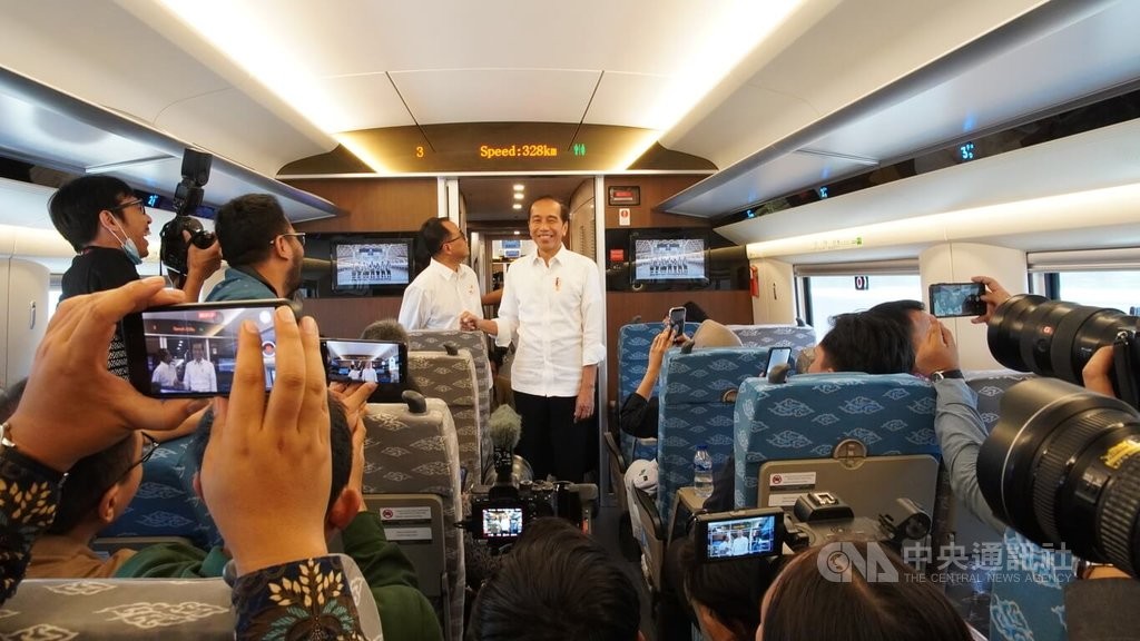 印尼總統佐試乘雅萬高鐵,當顯示時速超過350公里時,他大聲歡呼。圖源:台灣“中央”社 佐科威說,這是他首次搭乘雅萬高鐵,他希望民眾能夠從10月初開始使用這條高速鐵路。他說“現在印尼有捷運、輕軌和高鐵,若能和雅加達的機場快線整合,就能減少交通阻塞”。