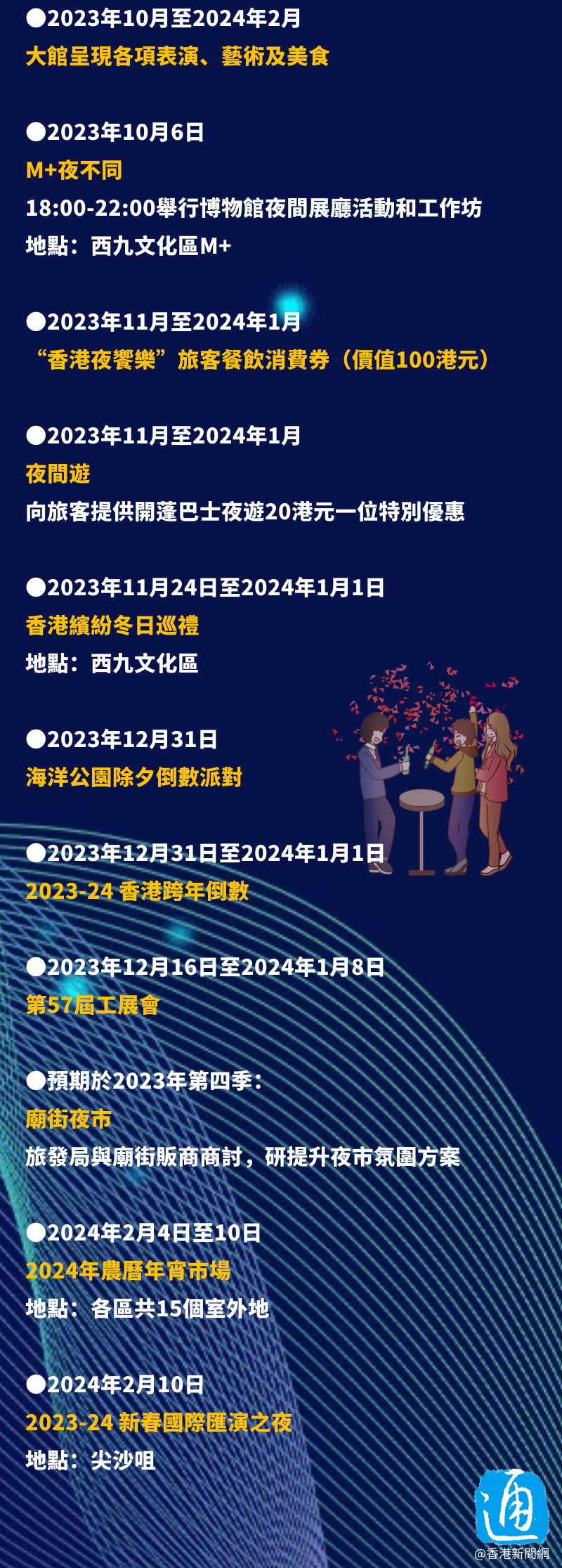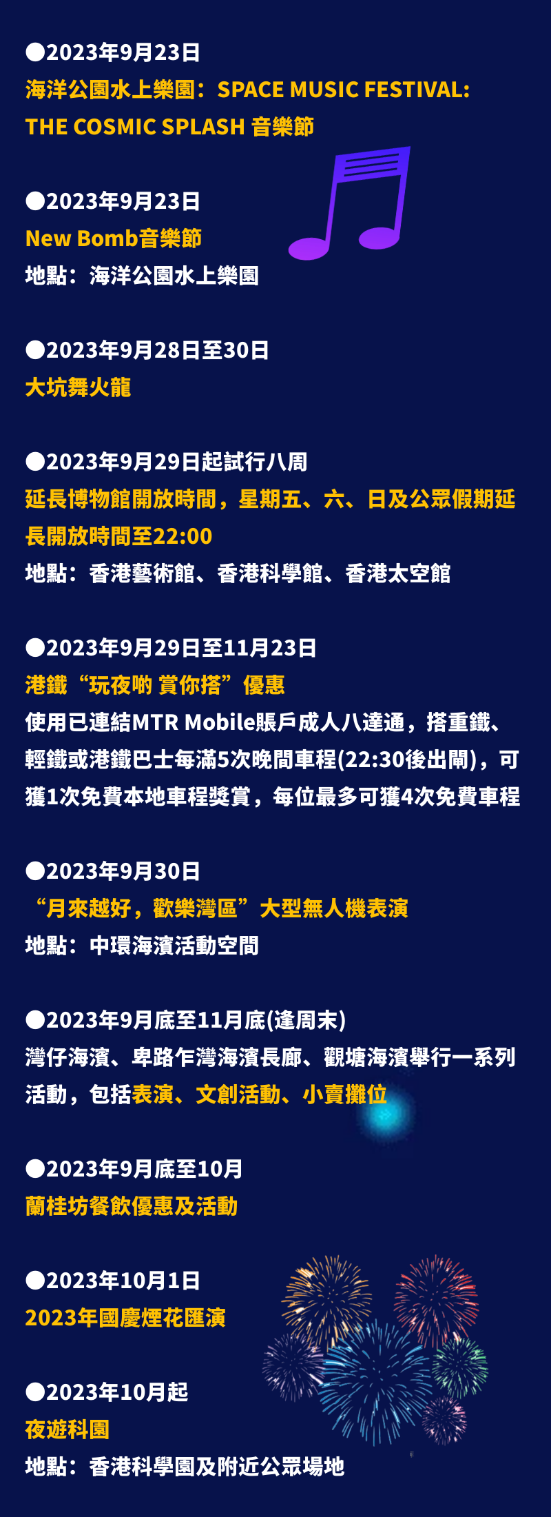 香港新聞網9月15日電 香港特區政府推出“香港夜繽紛”活動,宣布多項娛樂活動及優惠。 灣仔、觀塘及西環海濱,將舉行一系列活動,包括美食和手信攤位、音樂演出、無人機表演等。 各商場亦將舉辦夜市及“大笪地”活動。油麻地廟街,今年第四季將舉辦特色市集,將加添裝飾及美食活動。 康文署轄下的藝術館、科學館及太空館,周五、六及周日,將延長開放至晚上十時。明日(16日)起文化中心露天廣場、維多利亞公園等會舉行中秋綵燈會。 港鐵亦會在中秋節當天至11月23日,乘客有五晚在10時半後出閘,車程可免費一次。 各戲院會提供優惠,部分場次票價50元(港幣,下同),個別院線午夜場35元。 11月起至明年1月,將向旅客派發價值100元的“香港夜饗樂”消費券。 一圖看清“香港夜繽紛”活動詳情↓↓