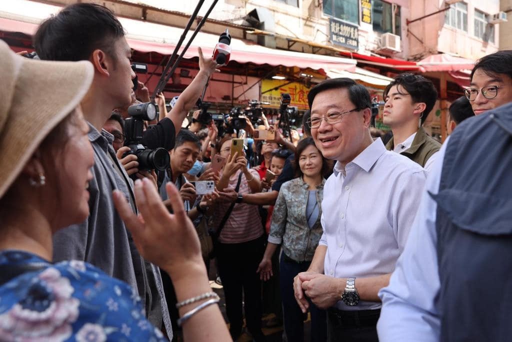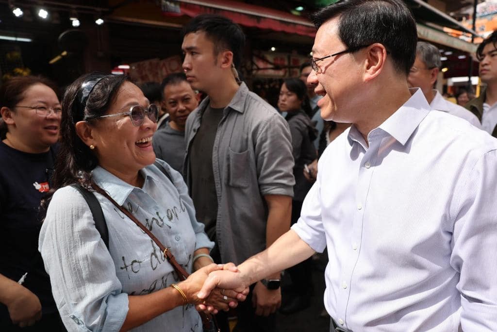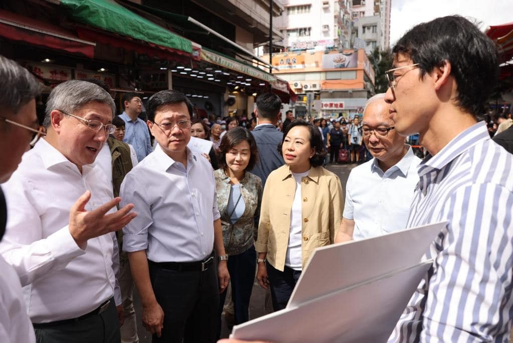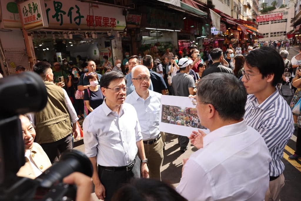李家超FB圖片。 沿途有不少市民圍觀及拍照,李家超向市民揮手打招呼。有市民大讚李家超親民,指與對方交談時提及街市情況。李家超在元朗新街逗留大約半小時,陪同的包括房屋局局長何永賢和民政及青年事務局局長麥美娟。