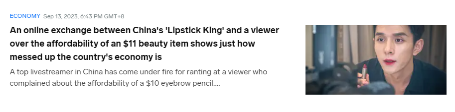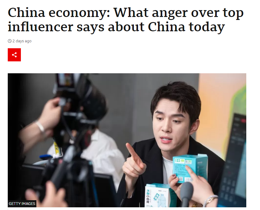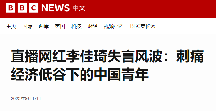文章稱,這場爭論發生在中國“後疫情經濟低迷期”,搬出中國的青年失業率。字里行間透露出“中國經濟快不行了”的感覺。 當然,英國B字媒體和美國C字媒體當然也不會放過這次機會。 前者英文標題直譯為“中國經濟: 對‘頂流’網紅的憤怒說明了什麼?”其中文網的標題則給出了所謂的答案——“直播網紅李佳琦失言風波:刺痛經濟低穀下的中國青年”。