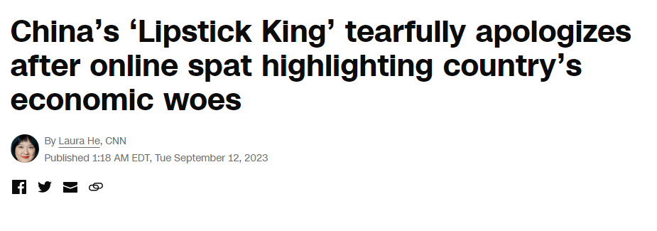 文章除了提及中國青年失業率創新高,“占中國全部財富三分之一的房地產業一直徘徊在全面危機的邊緣”外,幾乎都是“口水話”。甚至還引用了一條推特,直指這種憤怒也提供了一個窗口,讓人們看到中國年輕人中普遍存在的幻滅感。“在社交媒體上回應李佳琦事件的評論中,我看到了一個正在崩潰的中國”。 最後,來看看美國C的報道。它的標題是:“中國‘口紅大王’在網上引發口角凸顯國家經濟困境後,含淚道歉”。