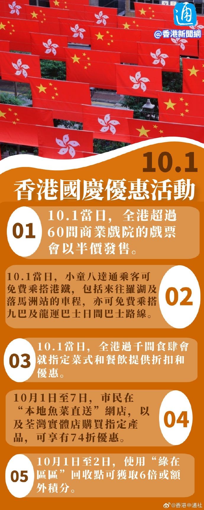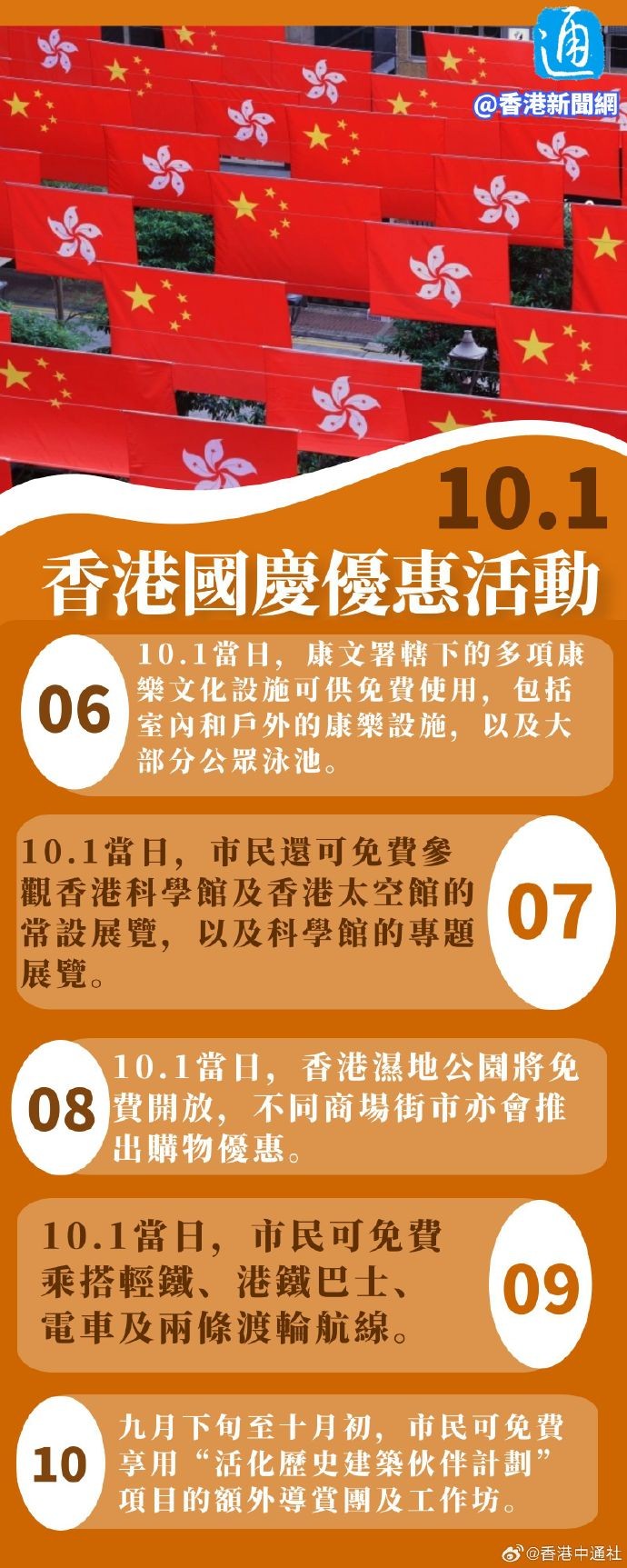 (香港中通社記者 謝光磊攝) 在交通方面,市民可在十一國慶當日免費乘搭輕鐵、港鐵巴士、電車及兩條渡輪航線;小童八達通乘客乘搭港鐵重鐵,包括羅湖、落馬洲過境的過境服務,以及九巴、龍運日間巴士路線免費。 此外,多個政府設施免費入場及使用,包括康文署室內和戶外康樂設施、絕大部分公眾泳池。市民亦可免費參觀科學館和太空館的常設展覽,以及科學館的專題展覽。濕地公園也將免費開放。 同時,10月1日至7日在“本地魚菜直送”網店,以及荃灣實體店購買指定產品,可享有74折;10月1日至2日“綠在區區”回收點可獲取6倍或額外積分。 李家超指,相隔5年還將重辦十一國慶煙花匯演,政府和民間組織也會在各區舉辦國慶活動。他形容國慶是舉國歡騰的大日子,感謝各界響應推動優惠和活動,鼓勵市民踴躍參與。