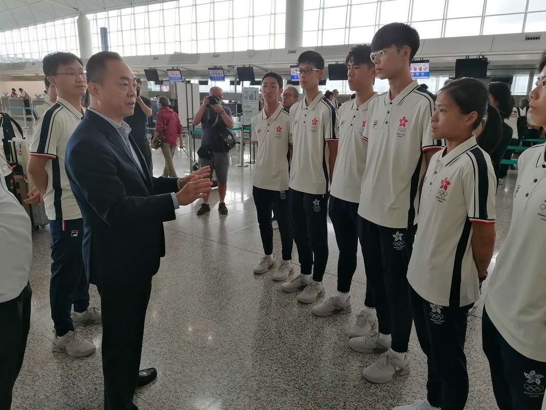 中國香港代表團部分成員今早(21日)在香港國際機場出發前往杭州。香港中通社記者 洪少葵 另外,賽艇預賽昨天已經展開,港隊上屆單人雙槳艇項目的銀牌得主趙顯臻,在今次初賽中以首名晉級準決賽,離金牌目標再近一步。而女子雙人單槳無舵艇項目中,張海琳及梁瓊允在初賽中力壓韓國,排名第2,有望衝擊獎牌。 中國香港代表團部分成員今早出發前往杭州,當中資深欖球選手姚錦成,以及武術運動員莫宛螢任港隊開幕禮持旗手。港協暨奧委會主席兼杭州亞運團長霍啟剛出席送行,指到機場沿途都有不少市民為代表團打氣,又形容杭州是港隊“半個主場”,強調對港隊十分有信心。