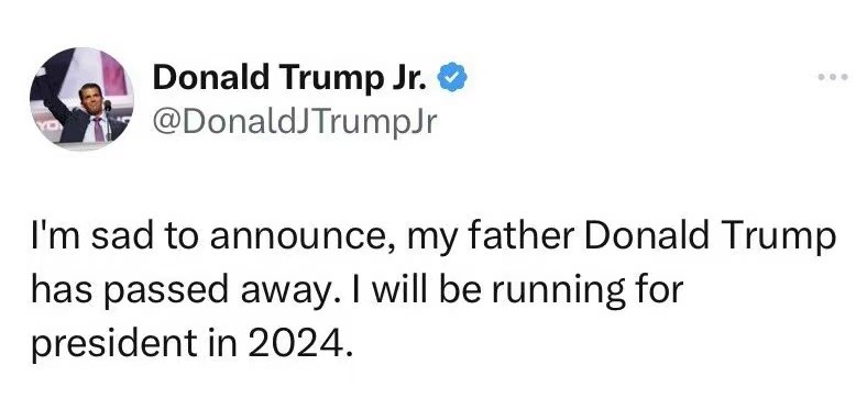 特朗普長子突發帖稱“父親去世”隨後稱賬號被黑分享到: